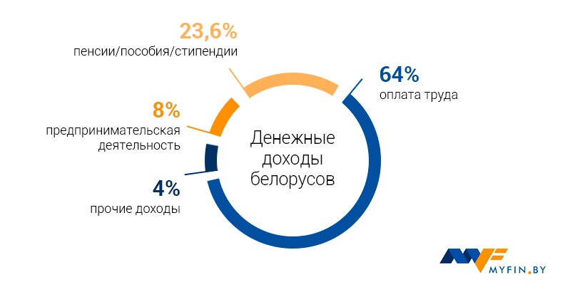 В общем объеме денежных доходов оплата труда занимает 64%, доходы от предпринимательской и иной деятельности, приносящей доход, – 8%. Трансферты населению (пенсии, пособия, стипендии и другие) – 23,6%, доходы от собственности и прочие доходы – 4,4%.