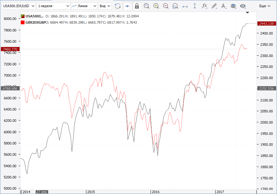 Рис. 5. Индексы S&P 500 и британский FTSE 100. На платформе MTBankFX это инструменты USA500.IDX/USD и GBRIDX/GBP соответственно.
