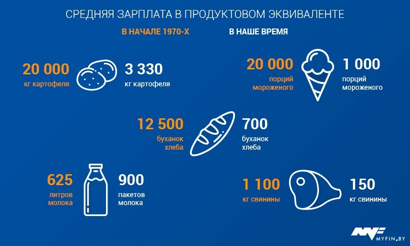 Исходя из среднего значения, можно посчитать, что на зарплату можно было купить около 12500 буханок хлеба, или 625 литров молока, или 20000 кг картофеля, или около 1100 кг мяса (свинины), или 20000 порций мороженого.