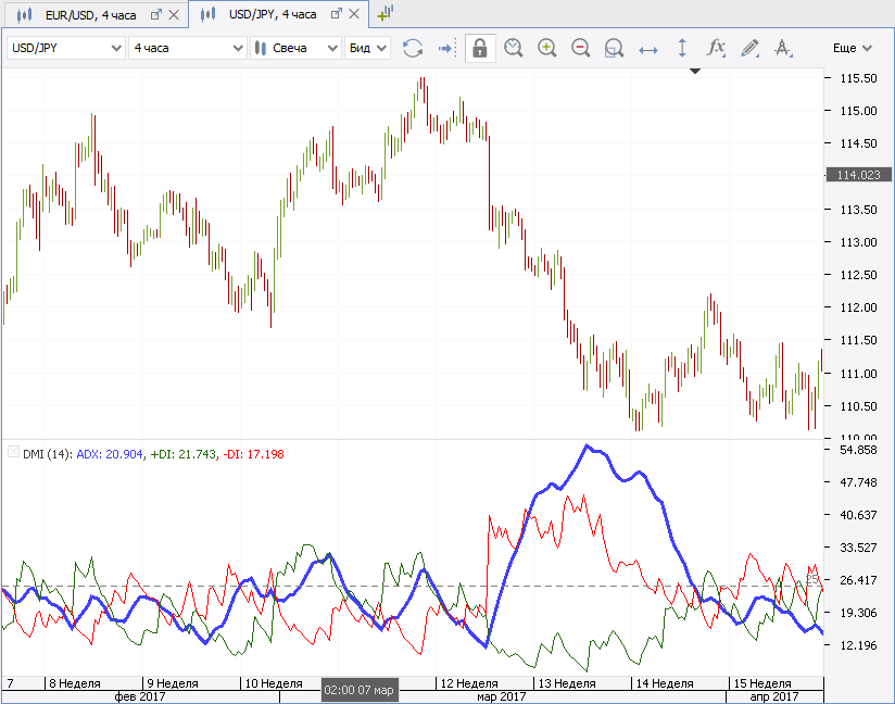 - Индекс ADX показывает чистое направленное движение (усредненное) и учитывает суммы индексов DI.
