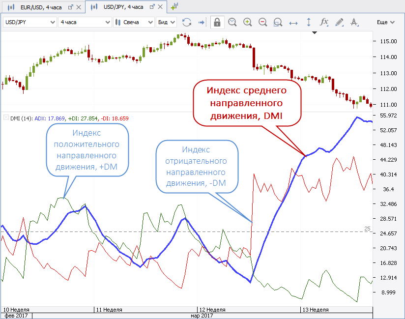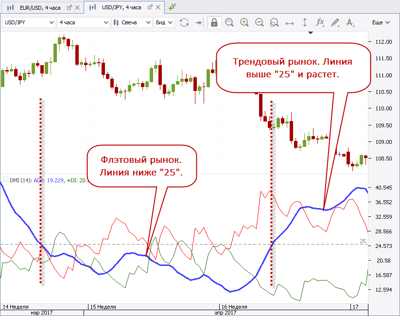 В окно индикатора обычно добавляют уровень "25", который помогает фильтровать флэтовые рынки, где нет сильных направленных движений.