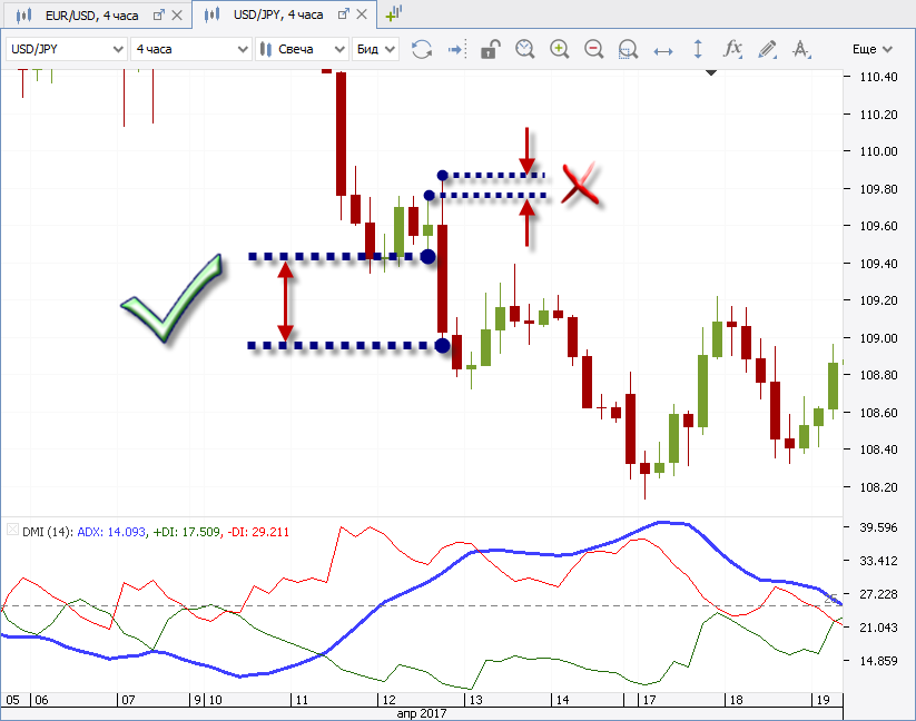 - Индекс положительного направленного движения +DI (зеленая линия на изображениях).