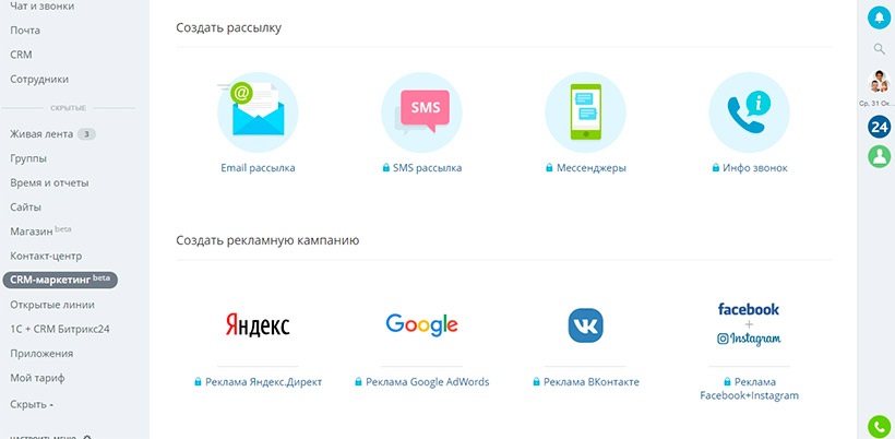 Также система предоставляет интегрированный с соцсетями и поисковыми системами инструмент CRM-маркетинг - для рассылок (e-mail, sms, мессендежры). С его помощью можно создавать таргетированные рекламные кампании. Весь маркетинг – в одном месте.