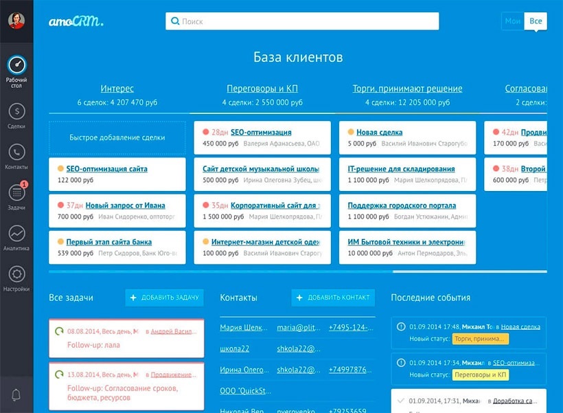 В рабочие модули системы входят: Сделки, Контакты, Задачи и Аналитика.