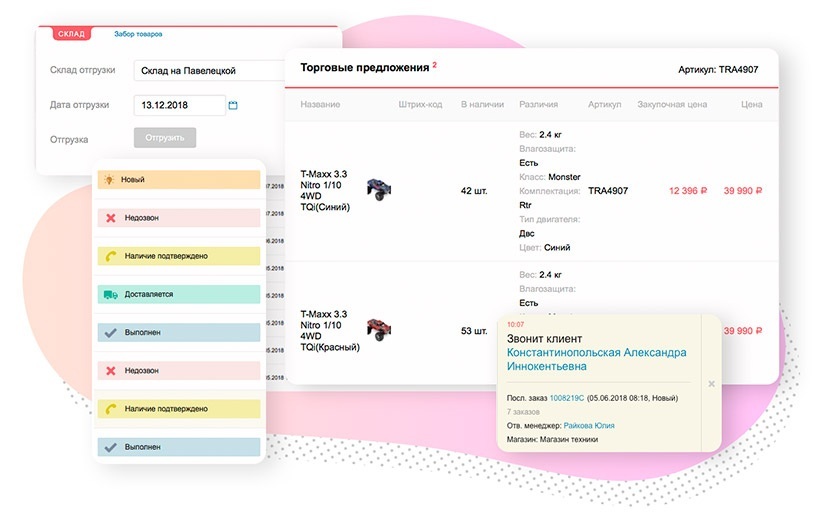 - Интеграция с каталогом товаров и складом. В карточках заказов отображаются актуальные данные по остаткам, запасам и складам, где находится товар;