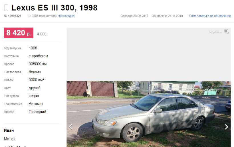 Lexus ES III 300 1998 года выпуска продается за 8 420 рублей, или $4 000. Продавец сообщает, что автомобиль полностью исправен, однако машина «требует покраски и работы с салоном».
