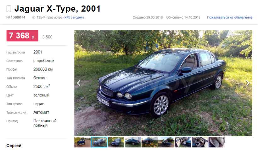 Jaguar X-Type 2001 года выпуска продается за 7 368 рублей, или $3 500. В объявлении не указано, на ходу ли машина, однако там отмечается, что с двигателем, коробкой передач и подвеской все в порядке.