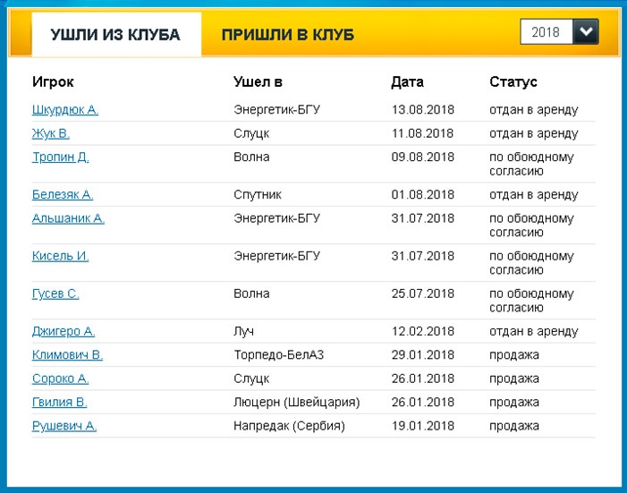 Вот так выглядит страница с трансферами на сайте БАТЭ: