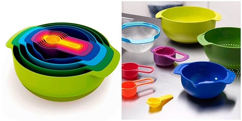 Во-первых, благодаря инновационному дизайну емкости компактно складываются одна в другую и занимают абсолютный минимум места — где бы они ни хранились. Во-вторых – 5 из 9 емкостей – позволяют измерять объемы ингредиентов.