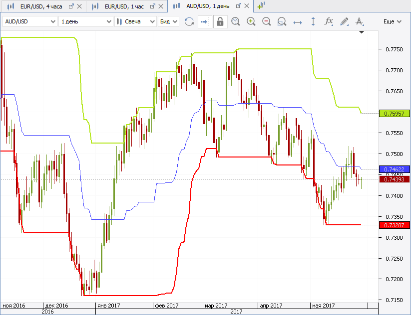 Рис. 1. Общий вид индикатора Donchian Channel - канал Дончяна.