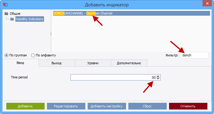 Что значит каждая его линия? Суть индикатора очень проста. Верхняя линия соединяет максимальные значения баров за последние 30 дней (отсюда параметр "30"). Нижняя линия соединяет минимальные цены баров за последние 30 дней. Средняя линия - это середина между верхней и нижней.