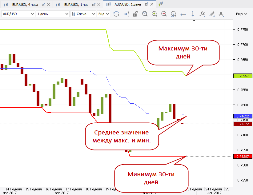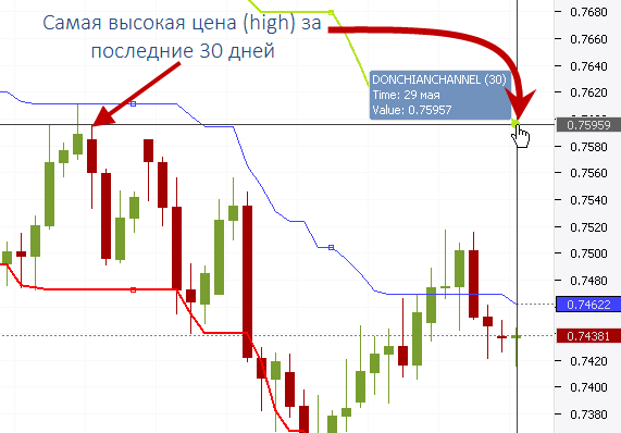 То есть на текущий бар приходятся такие точки индикатора, которые соответствует максимальной и минимальной ценам на этом графике за последние 30 дней - или 30 баров, если это не дневной график.