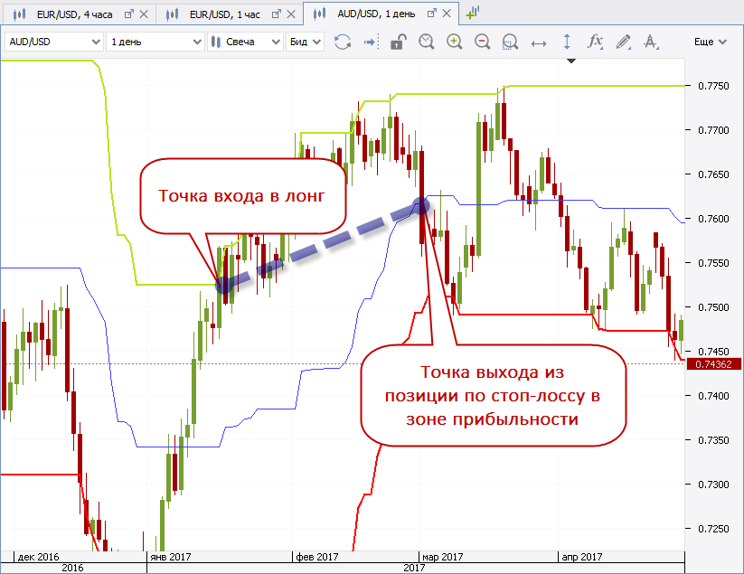 Для позиции "шорт", соответственно, используется растущая красная линия, сделка открывается в момент пересечения линии ценой. Стоп-лосс выставляется на уровне синей линии и ведется вниз за ценой.