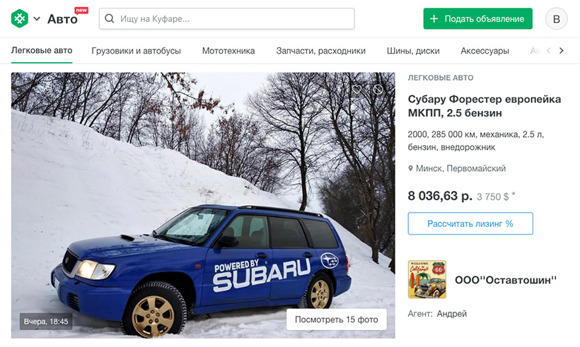 В категории «до $4 000» на Куфар Авто можно найти даже полноприводный Subaru Forester. Под капотом машины — бензиновый двигатель в 2,5 литра, благодаря чему автомобиль справляется даже с серьезным бездорожьем. В объявлении указано, что последние 12 лет у машины был один хозяин. Судя по фото, кожаный салон в отличном состоянии. Продавец утверждает, что с двигателем, коробкой передач, сцеплением, электроникой тоже все в порядке. Немаловажный плюс — машину готовы продать в лизинг или кредит.