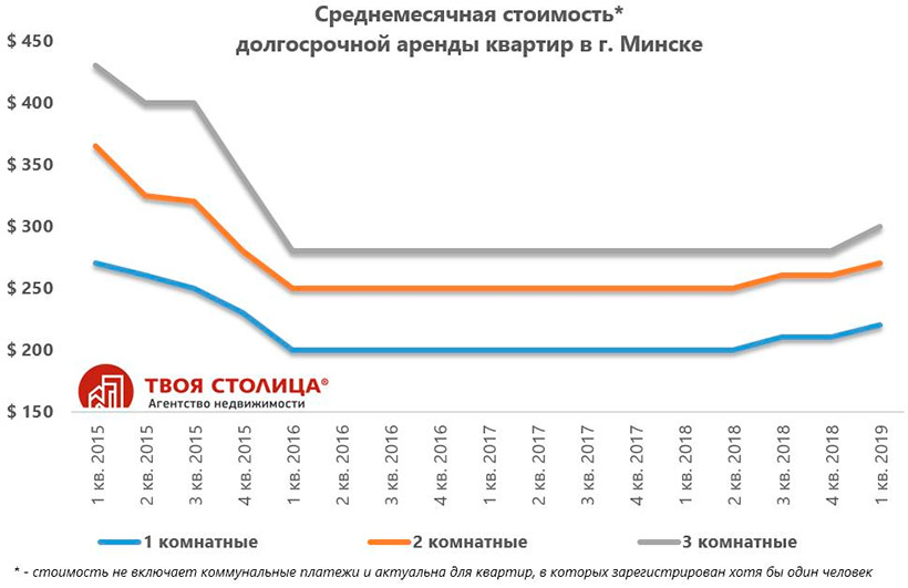 Стоимость аренды квартиры в Минске держалась неизменной два с половиной года – с начала 2016 г., когда снижение цен прекратилось, и по лето 2018 г. Средняя стоимость аренды однокомнатной квартиры стандартных потребительских качеств в то время была на уровне $190-200 в месяц для однокомнатных квартир, $240-250 в месяц для двухкомнатных, а трехкомнатную можно было арендовать даже за $260 в месяц. Указанные стоимости приведены без учета коммунальных платежей и актуальны для квартир, в которых был зарегистрирован хотя бы один человек.