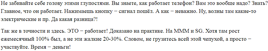 Не будем глубоко погружаться в пирамиду МММ 2012. Скажем только, что этот МММ еще дальше ушел в интернет, работал через личные кабинеты и программы, но без десятников и пр сложных схем. В МММ 2012 и следующих МММ участники переводили деньги друг другу и называли  это не «взносом», а «помощью».