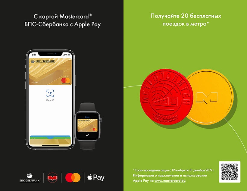 Начиная с 20 ноября и до 20 декабря всем держателям карт Mastercard, которые оплачивают Apple Pay проезд на турникетах в Минском метрополитене, Mastercard и БПС-Сбербанк дарят 20 бесплатных поездок. А с 20 ноября до 3 декабря при оплате в МакДональдс заказа от 8 рублей картой Mastercard БПС-Сбербанка с Apple Pay в подарок можно получить десерт МакФлурри.