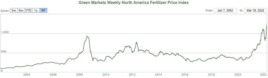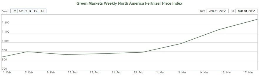 Стоимость удобрений на мировых рынках сейчас бьет один рекорд за другим. Журнал Fortune сообщал о том, что средние цены на удобрения на прошлой неделе подскочили почти на 10% по сравнению с предыдущими согласно индексу Green Markets North America и достигли самого высокого показателя за всю историю. Издание отмечает, что в целом цены сейчас на 40% выше, чем месяц назад, до начала событий в Украине.