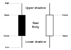 Если за период времени цена выросла (открытие ниже, закрытие – выше), то прямоугольник между двумя этими ценами (тело свечи) окрашивается в какой-либо цвет (например, белый). Если же цена упала (открытие выше, закрытие – ниже), то тело свечи окрашивается в другой цвет (например, чёрный). Таким образом, секундного взгляда на график достаточно чтобы понять, куда движется цена за последнее время, а также оценить интенсивность движения. Цвет свеч произвольный, торговый терминал Форекс даёт возможность самостоятельно настраивать все параметры, включая фон, шрифт и др. Например, традиционный китайский вариант – зелёные свечи при росте (бычьи) и красные – при падении (медвежьи).