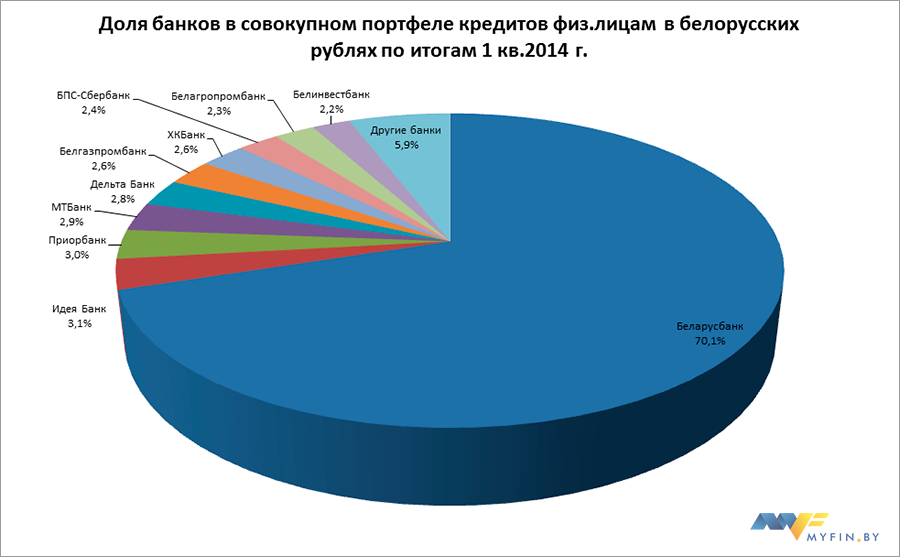 Если говорить о кредитовании физических лиц в белорусских рублях, то здесь, на первый взгляд, безусловным лидерам является Беларусбанк – ему принадлежит 70,1% рынка. Однако нужно понимать, что львиная доля кредитов Беларусбанка физическим лицам приходится на кредиты на недвижимость. Только в 2013 году банк выдал на строительство и приобретение жилья 10 171,1 млрд белорусских рублей, в 1 квартале 2014 года – еще 3 446,6 млрд. Поэтому если говорить непосредственно о потребительском кредитовании, доля рынка Беларусбанка не так уж и велика.
