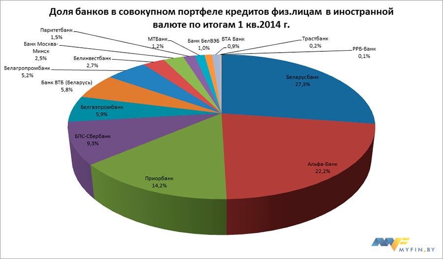Наибольшие остатки кредитов физическим лицам в иностранной валюте принадлежат Беларусбанку (27,3% рынка).