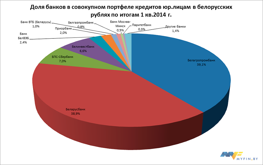 При этом совокупный объем кредитов в белорусских рублях, выданных юридическим лицам, по состоянию на 1 апреля 2014 года составил 77 915,6 млрд белорусских рублей, увеличившись по сравнению с 1 января 2014 года на 2,56%.