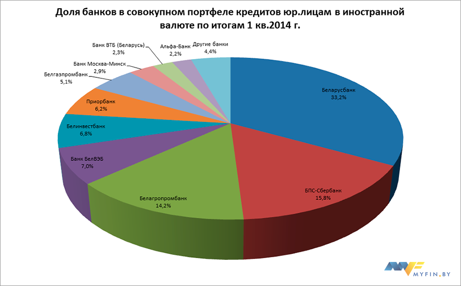 Кредитование юридических лиц в иностранной валюте в 1 квартале 2014 года росло быстрее кредитования в белорусских рублях. Так, совокупный объем кредитов в иностранной валюте, выданных юридическим лицам, по состоянию на 1 апреля 2014 года составил 137 754,4млрд белорусских рублей в эквиваленте, увеличившись по сравнению с 1 января 2014 года на 6,42%.