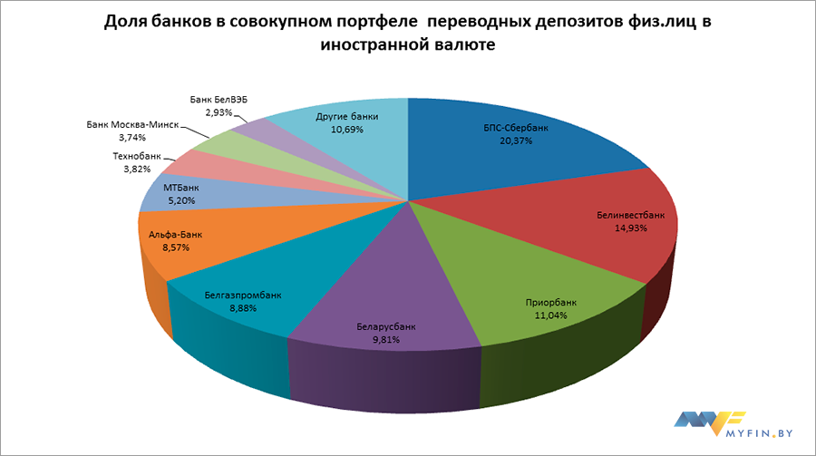 В совокупном портфеле переводных депозитов юр.лиц в иностранной валюте половина рынка принадлежит Беларусбанку (49,93%), 10% - БПС-Сбербанку, 9,03% - Приорбанку.