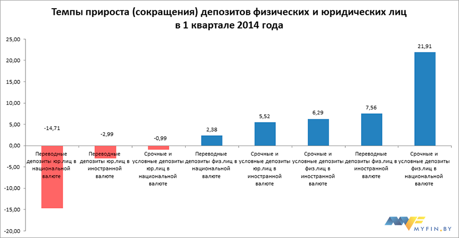 - Юридические лица существенно сократили остатки на счетах в банках в 1 квартале 2014 года. Переводные депозиты в белорусских рублях сократились на 14,71%, в иностранной валюте – на 2,99%. Что касается срочных депозитов юр.лиц, то в белорусских рублях они сократились на 0,99%, а в иностранной валюте – приросли на 2,38%.