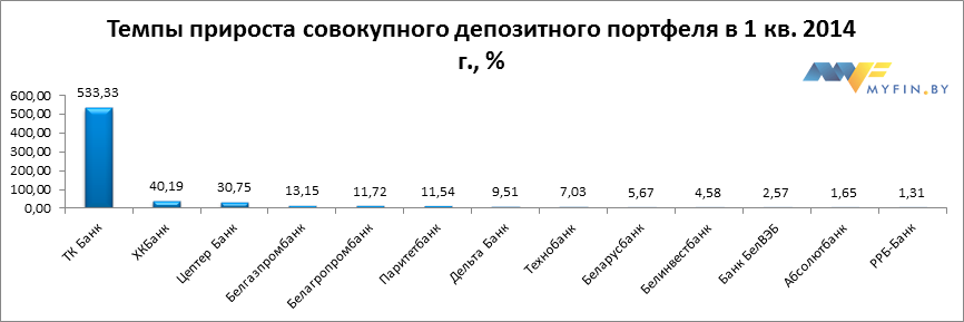 Наибольшие темпы прироста депозитов физических лиц в 1 квартале 2014 года продемонстрировали ХКБанк, Белгазпромбанк, Цептер Банк, Белагропромбанк, БТА Банк и другие игроки.