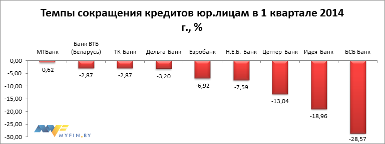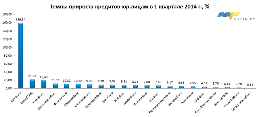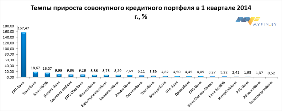 В таблице ниже представлена информация об объемах кредитов, выданных физическим и юридическим лицам каждым из банков Беларуси по состоянию на 1 апреля 2014 года, а также темпы прироста кредитных портфелей банков в 1 квартале 2014 года и изменение позиций в рейтинге по сравнению с 1 января 2014 года.