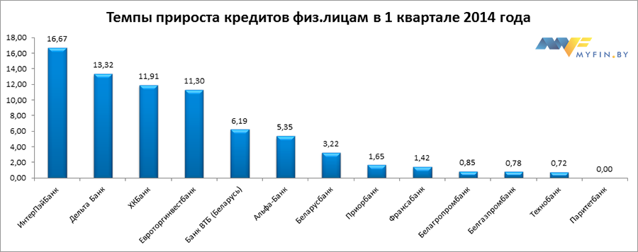 Наибольшие темы прироста кредитования физических лиц в 1 квартале 2014 года продемонстрировали ТК Банк, Банк ББМБ, БИТ-Банк, Абсолютбанк, Евробанк.