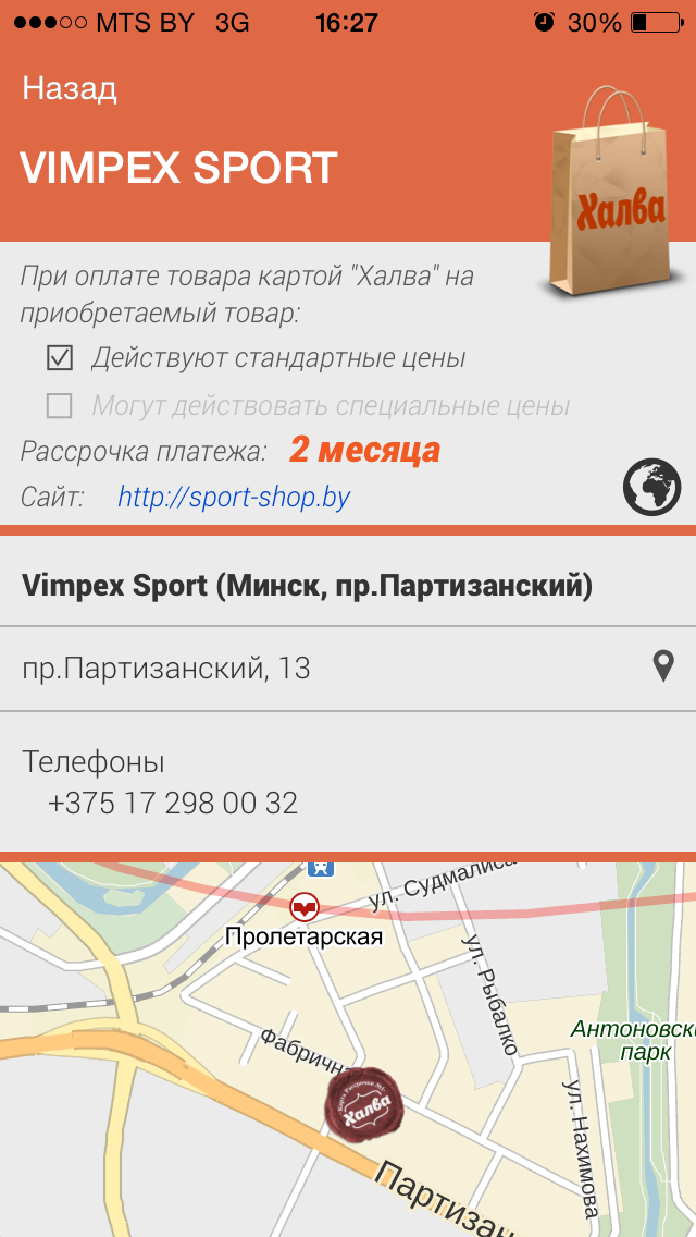 С помощью мобильного приложения вы не только сможете узнать, какие именно торговые объекты обслужат вас по карте «Халва», но и уточните срок действия рассрочки, узнаете, какие цены будут действовать при оплате товаров картой рассрочки, а также сможете найти описание и контактные данные выбранного торгового объекта. Кроме того, вы никогда не заблудитесь по пути к «халвичным» магазинам, потому что мобильное приложение МТБанка используется технология геолокации.