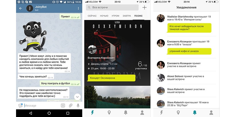 Первая версия Joiny, которую мы выпустили, была совершенно недружелюбной. Это было web-приложение, и пользоваться им было невозможно. Но буквально за пару месяцев, участвуя в разных конференциях, конкурсах и хакатонах, мы поняли, что это не то, что нужно рынку, и принялись за реализацию мобильного приложения. В июне 2016-го у нас сложилась первая команда, начавшая делать продукт близкий к тому, который есть сейчас.