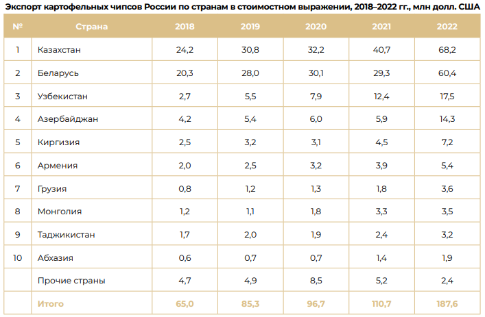 В стоимостной структуре экспорта картофельных чипсов России лидерами также были Казахстан (36,3%) и Беларусь (32,2%). В топ-5 импортеров российской продукции также вошли Узбекистан (9,3%), Азербайджан (7,6%) и Кыргызстан (3,9%).