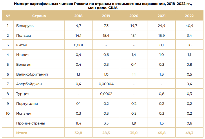 В 2022 году Россия поставила на мировой рынок 44 тыс. тонн картофельных чипсов на сумму $187,6 млн, превысив показатели 2021 года на 0,9% в натуральном выражении и на 69,5% в стоимостном.