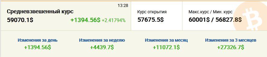 Утром 15 октября цена биткоина на криптобирже Bitfinex впервые с середины апреля превысила $60 тыс. За прошедшие сутки главная криптовалюта подорожала на 3%.