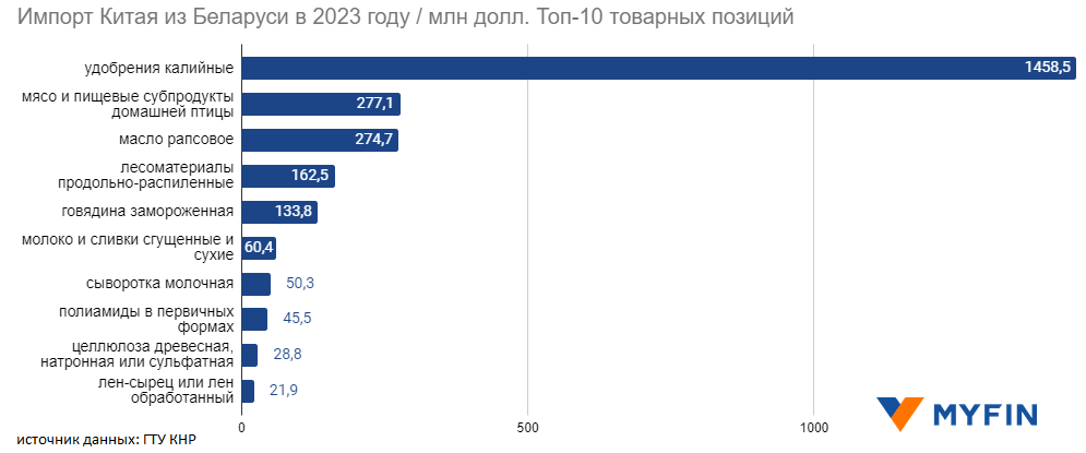 В прошлом году ключевой позицией китайского импорта из Беларуси были калийные удобрения. По итогам января – декабря 2023 года за ввоз белорусского калия КНР заплатила около $1,46 млрд.