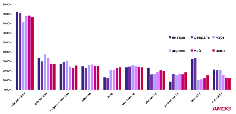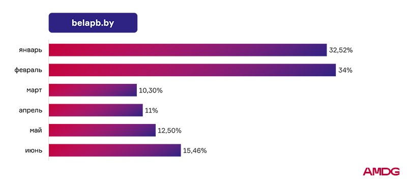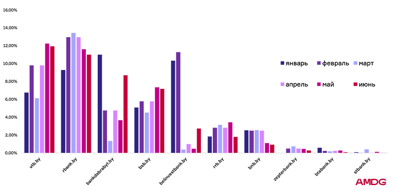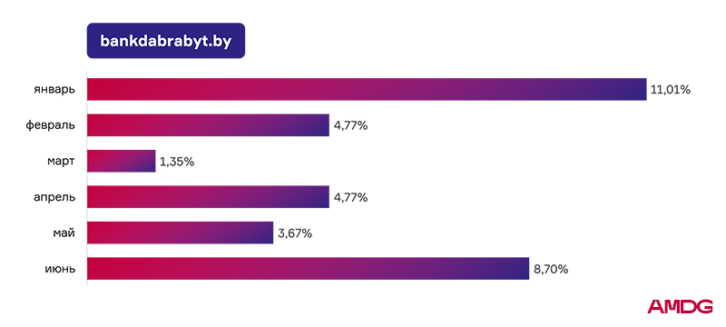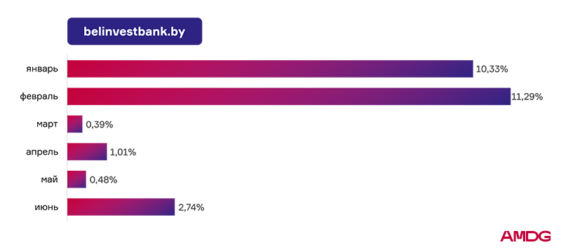 Показатель Банка Дабрабыт в первом полугодии оказался самым нестабильным. В середине периода видимость снизилась до 1,45%. Банк потерял 9,66% по отношения к январским значениям. В июне наблюдается постепенное восстановление ― рост до 8,70%.