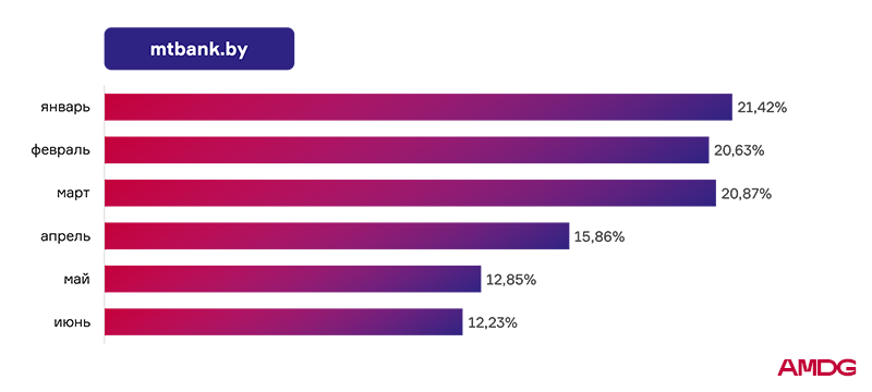 С февраля у МТБанка началось падение видимости, но самое серьезное снижение наблюдалось в апреле, когда банк потерял 5%. С апреля по июнь показатель достиг своего минимума в 12,23%.