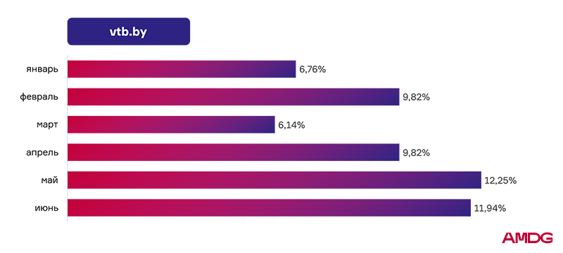 У Банка ВТБ наблюдался скачок роста видимости в феврале с 6,76% до 9,82%, после которого последовало мартовское падение на 3,68%. К июню показатель вырос до 11,94%.