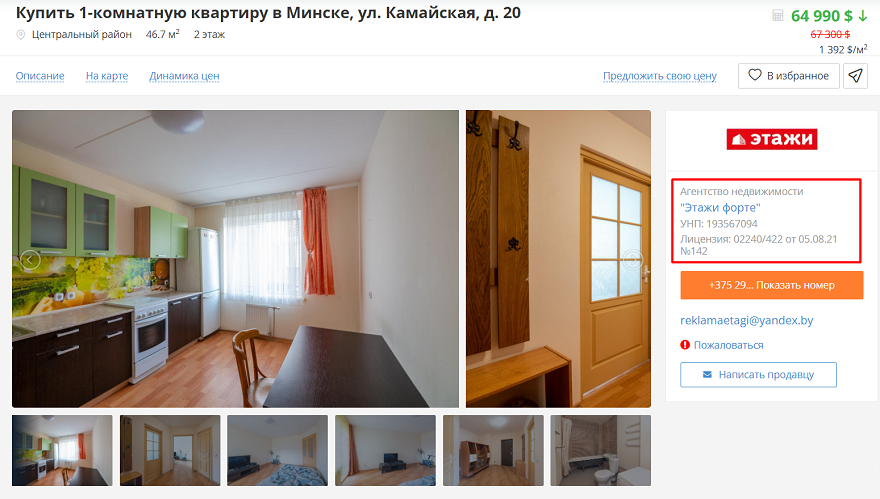 Однако для агентств существуют правила размещения. По ним можно определить, настоящее ли это объявление. В своих рекламных материалах агентства обязаны указать номер и дату заключения договора с собственником, а также учетный номер плательщика (УНП), номер и дату выдачи лицензии для оказания риэлтерских услуг.