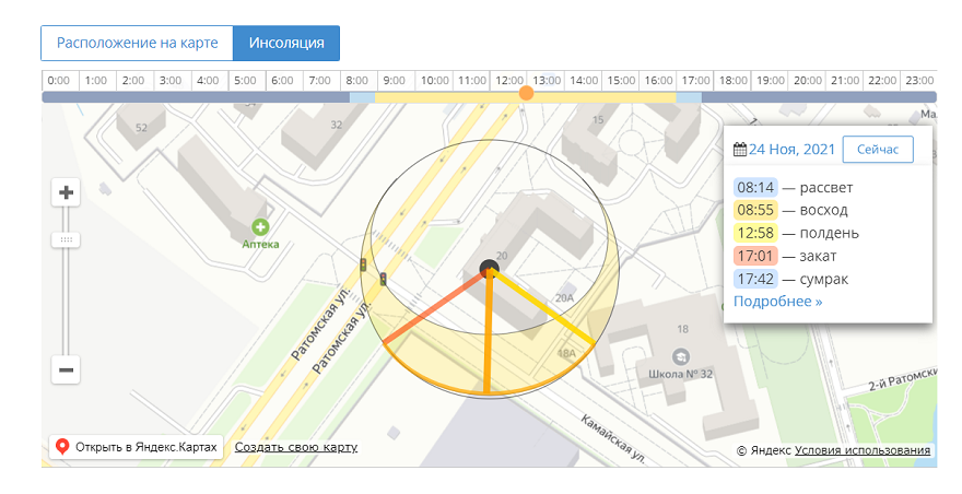 - На странице объявления можно заранее посмотреть, будет ли ваша квартира солнечной;