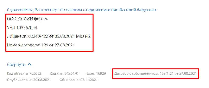 На Domovita.by для этих данных есть специальные поля. Данные об УНП и лицензии можно найти в колонке контактов с правой стороны от фотографий. А номер и дату договора внизу под объявлением вместе с датой публикации. Также агентства зачастую дублируют эту информацию в описании объекта.