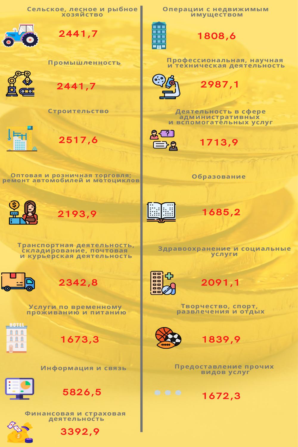 В финансовой и страховой деятельности номинальная начисленная средняя зарплата составила 3392,9 руб., в профессиональной, научной и технической деятельности – 2987,1 руб.