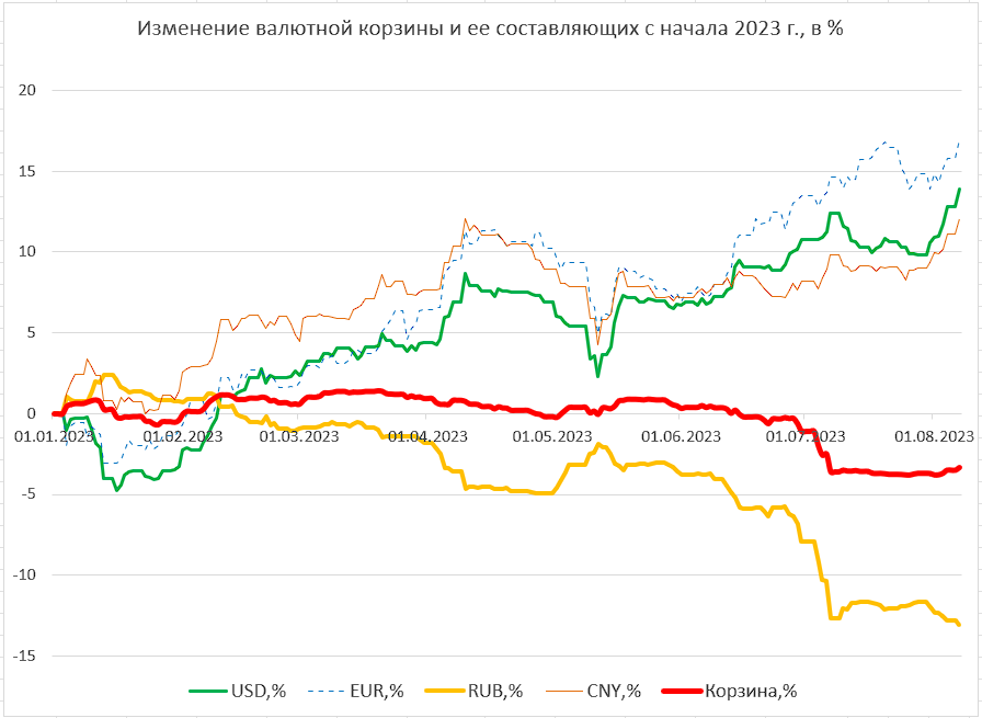Как и неделей ранее, рост доллара и юаня в составе корзины «перевесил» снижение российского рубля. В результате стоимость валютной корзины после выросла на 0,39%. Национальная валюта снижается к корзине вторую неделю подряд.