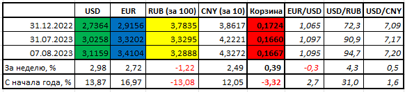 В результате всех этих событий доллар по итогам недели укрепился. Евро по отношению к доллару снизился с 1,0970 до 1,0950 (-0,3%). К юаню доллар подрос с 7,17 до 7,20 (+0,5%). К российскому рублю доллар вырос значительно сильнее, с 90,7 до 94,7 (+4,3%), обновив максимум с 25 марта 2022 года. Отметим, что к евро и российской валюте доллар растет третью неделю подряд.