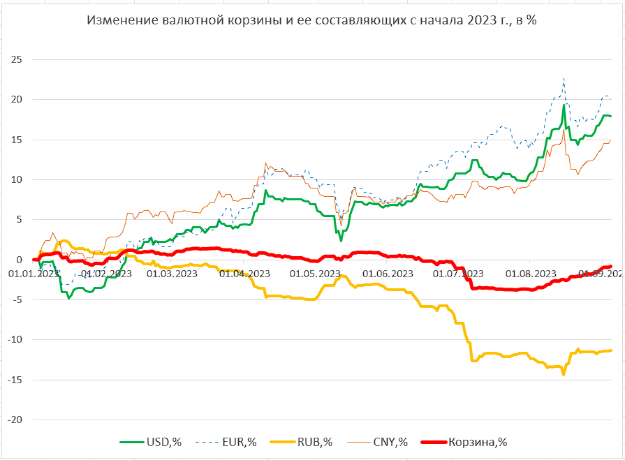 Рост всех валют сразу, очевидно, привел к очередному росту валютной корзины. По итогам недели стоимость валютной корзины выросла на 0,84%. Национальная валюта снижается к корзине шестую неделю подряд. И все еще остается ниже, чем в начале года. Это можно интерпретировать, что по отношению к корзине валют основных торговых партнеров белорусский рубль крепче, чем был на начало года. Исключительно благодаря своему укреплению к российской валюте.