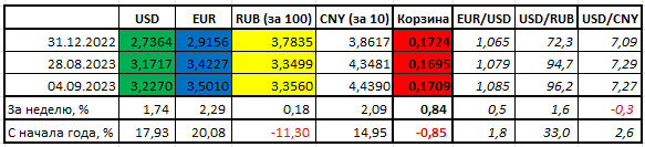 В результате снижения вероятности роста ставки по доллару американская валюта просела к другим основным мировым валютам за исключением российского рубля. По итогам недели евро подрос к доллару с 1,0790 до 1,0850 (+0,5%). Одновременно доллар снизился к юаню с 7,29 до 7,27 (-0,3%). Но вместе с тем доллар подорожал к российскому рублю с 94,7 до 96,2 (+1,6%).