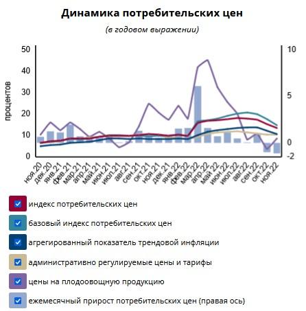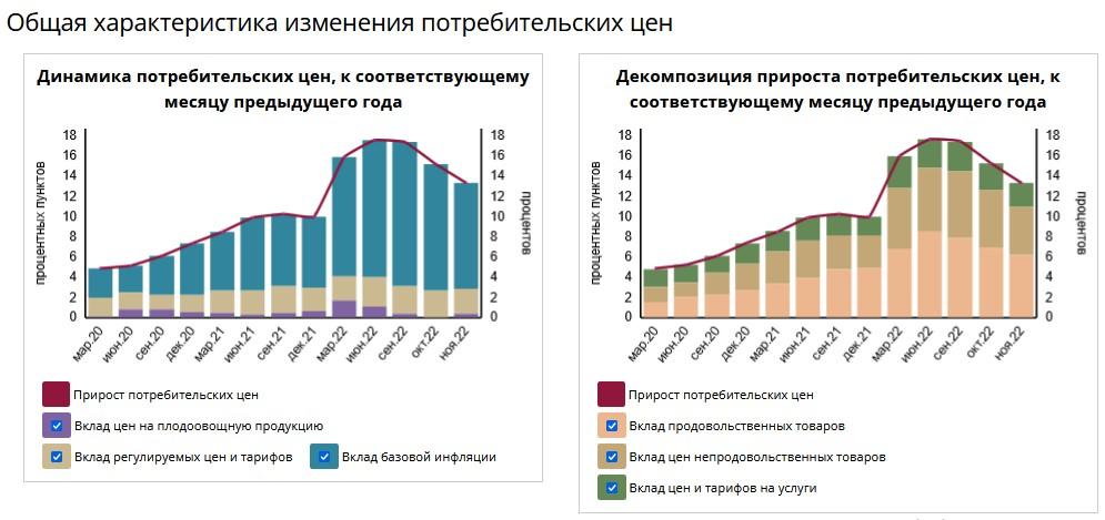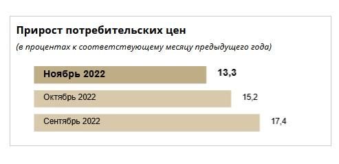 В ноябре 2022 года годовой прирост потребительских цен составил 13,3% (в октябре и сентябре было 15,2% и 17,4% соответственно), отмечает регулятор.